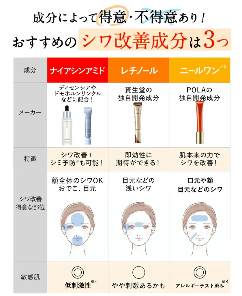 特に、「ナイアシンアミド」は敏感になりやすい大人肌でも使いやすい成分なので、初めてシワ改善クリームを試す人にはおすすめです!