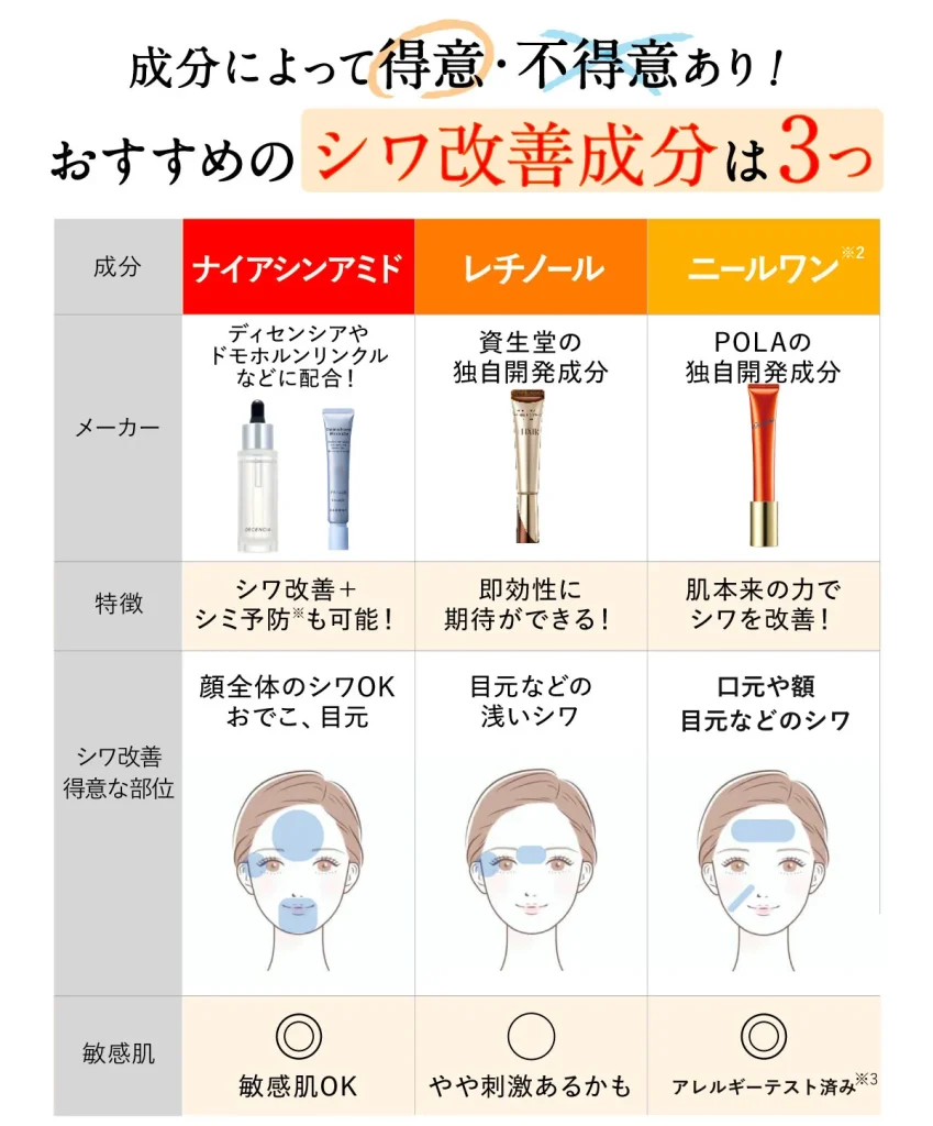 また、有効成分によって改善できるシワの部位に「得意」「不得意」があります。