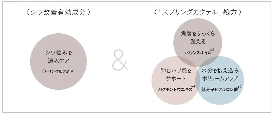リンクルO/Lコンセントレートにふっくら弾むようなハリ肌を目指せる「スプリングカクテル処方」を採用。